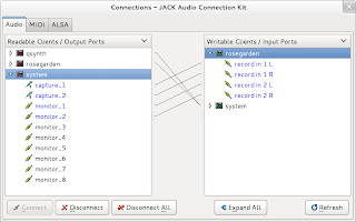 However, in order to record MIDI data created with a virtual keyboard meant I had to plug it into something that records MIDI data – Rosegarden. It was back to the QJackCtl Connect dialog: