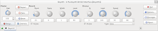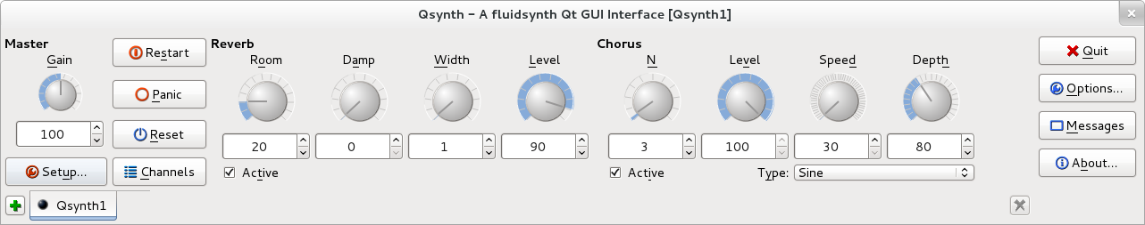 It normally comes with a “SoundFont” bank containing a nice range of sounds for a beginner, so it seemed a good start. However to use FluidSynth it’s best to have a nice graphical interface so you can fiddle with it using knobs and buttons on your desktop. The most common one is called QSynth. It looks very impressive!