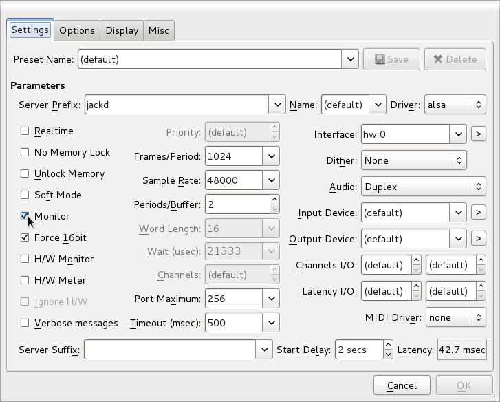 su -c "modprobe snd-seq-midi"It took me an hour or so to find that out, and before I did so I couldn’t start JACK or make any noise at all. Normally I would have given up long before this point, but with M4 and Mr Cable The Sysadmin ringing in my ears I was determined and pressed on.